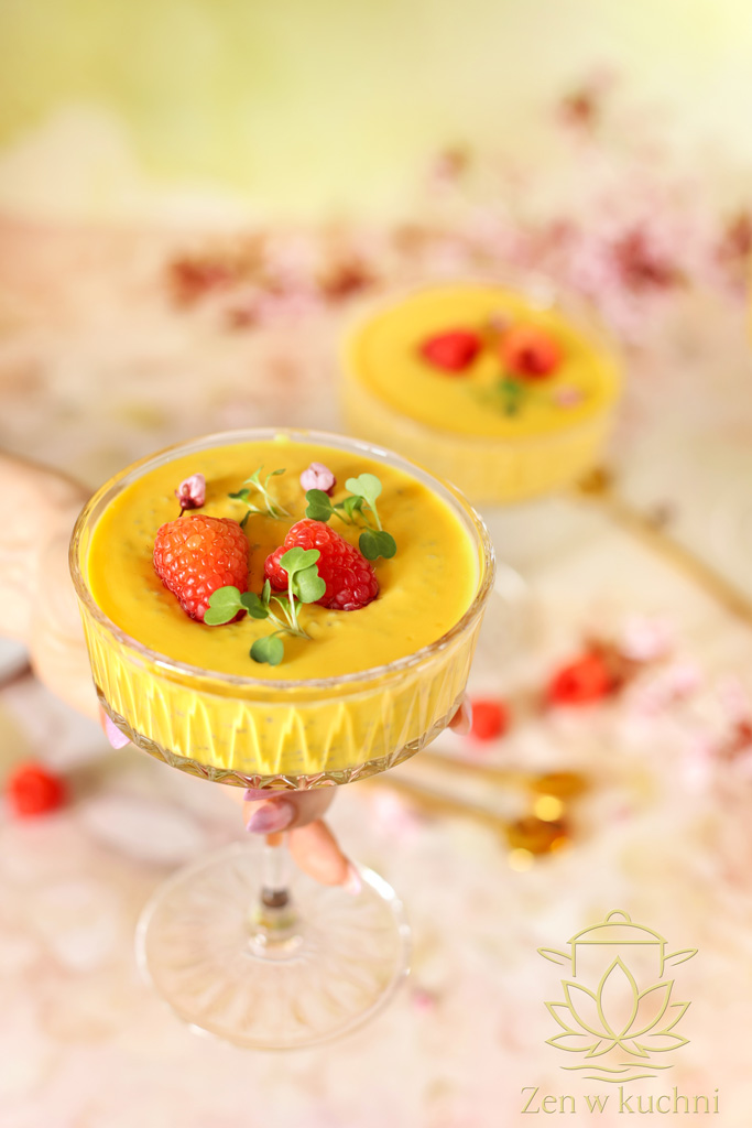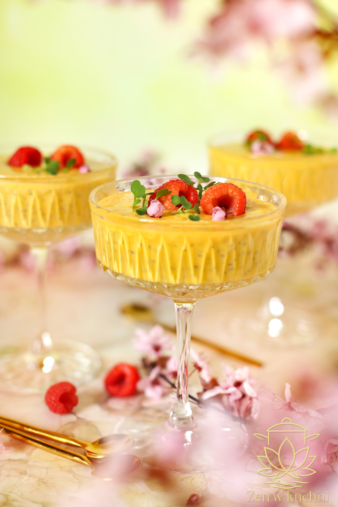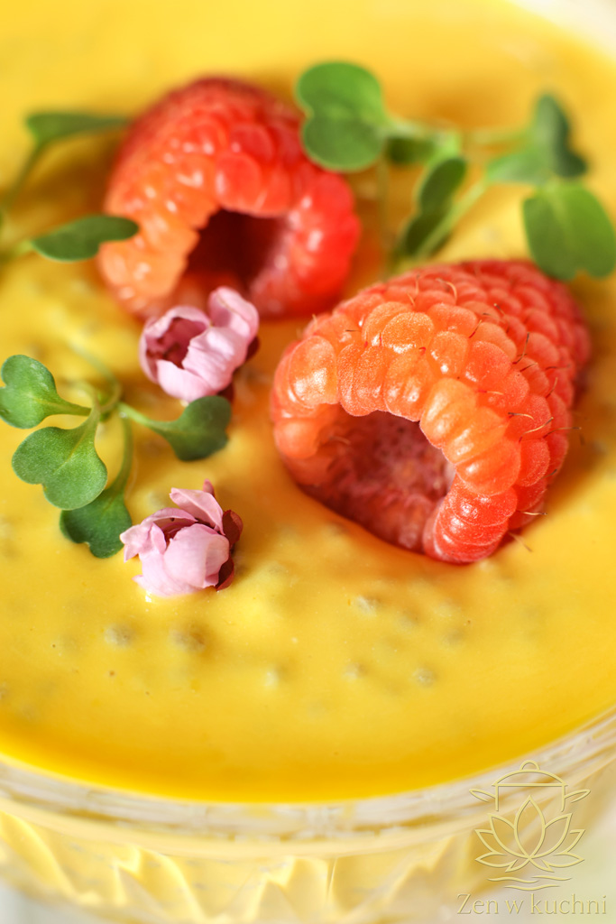 Deser chia z mango, skyrem i malinami