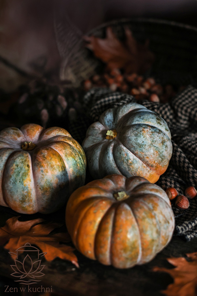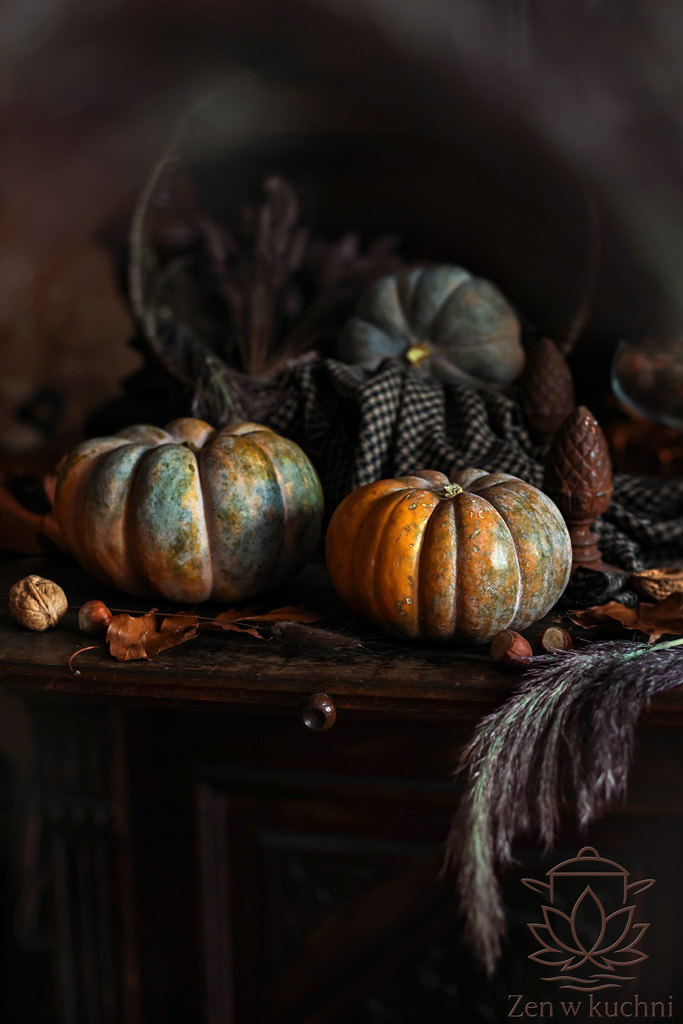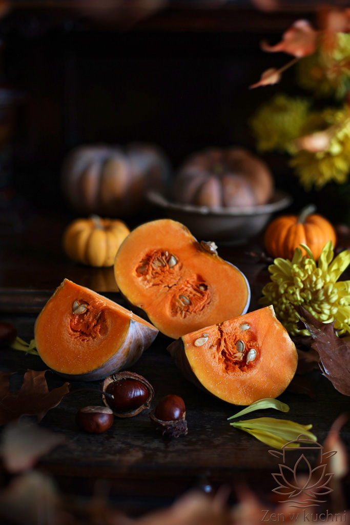 Do stylizacji wykorzystałam dynie prowansalskie w ciekawej tonacji kolorystycznej. Mają przepiękne głęboko pomarańczowe wnętrze, co widać na zdjęciach.