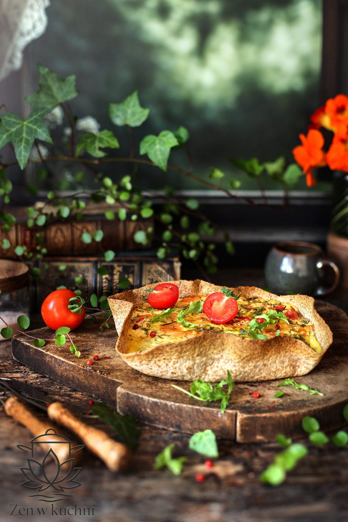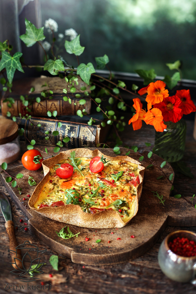Masę wyłóż na tortillę w naczyniu, wyrównaj i piecz około 30-35 minut aż masa się zarumieni.